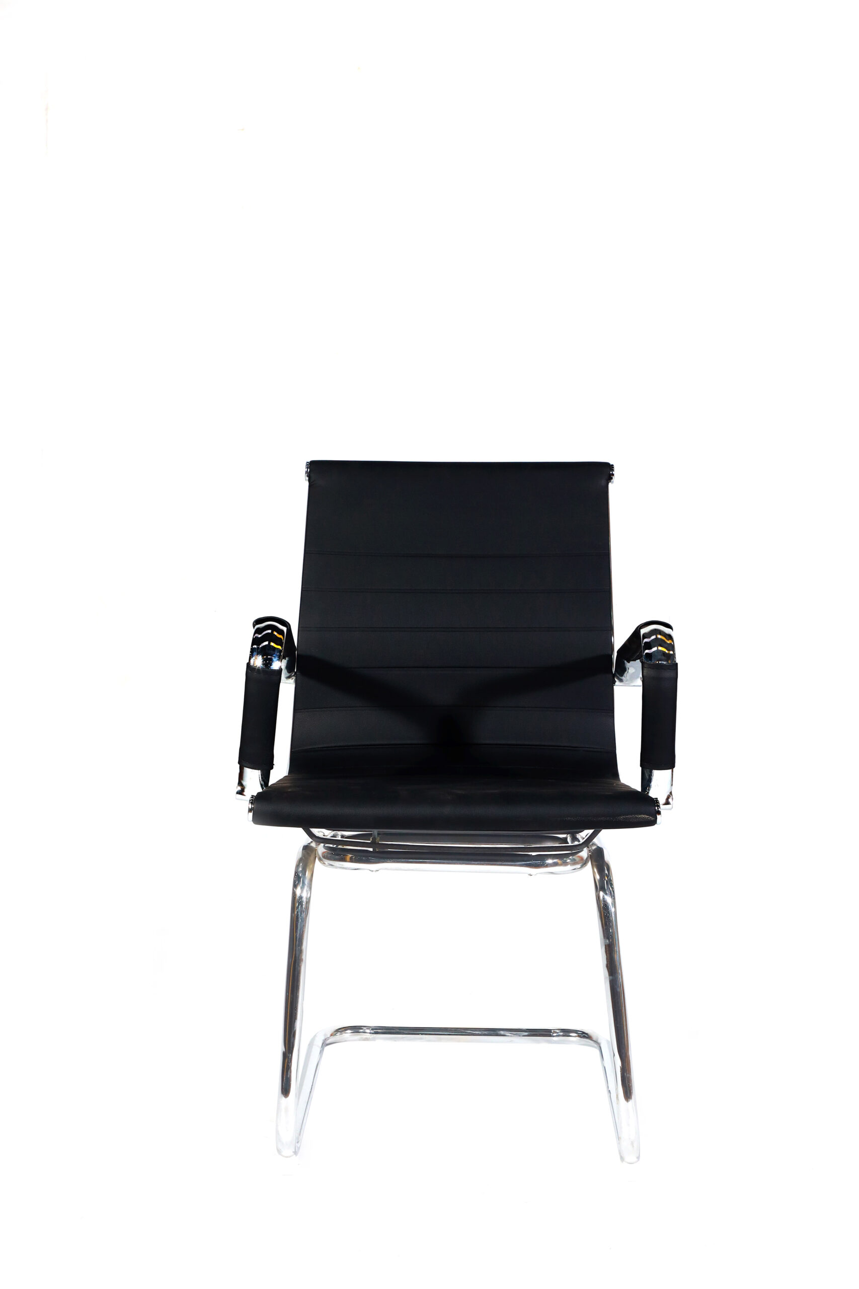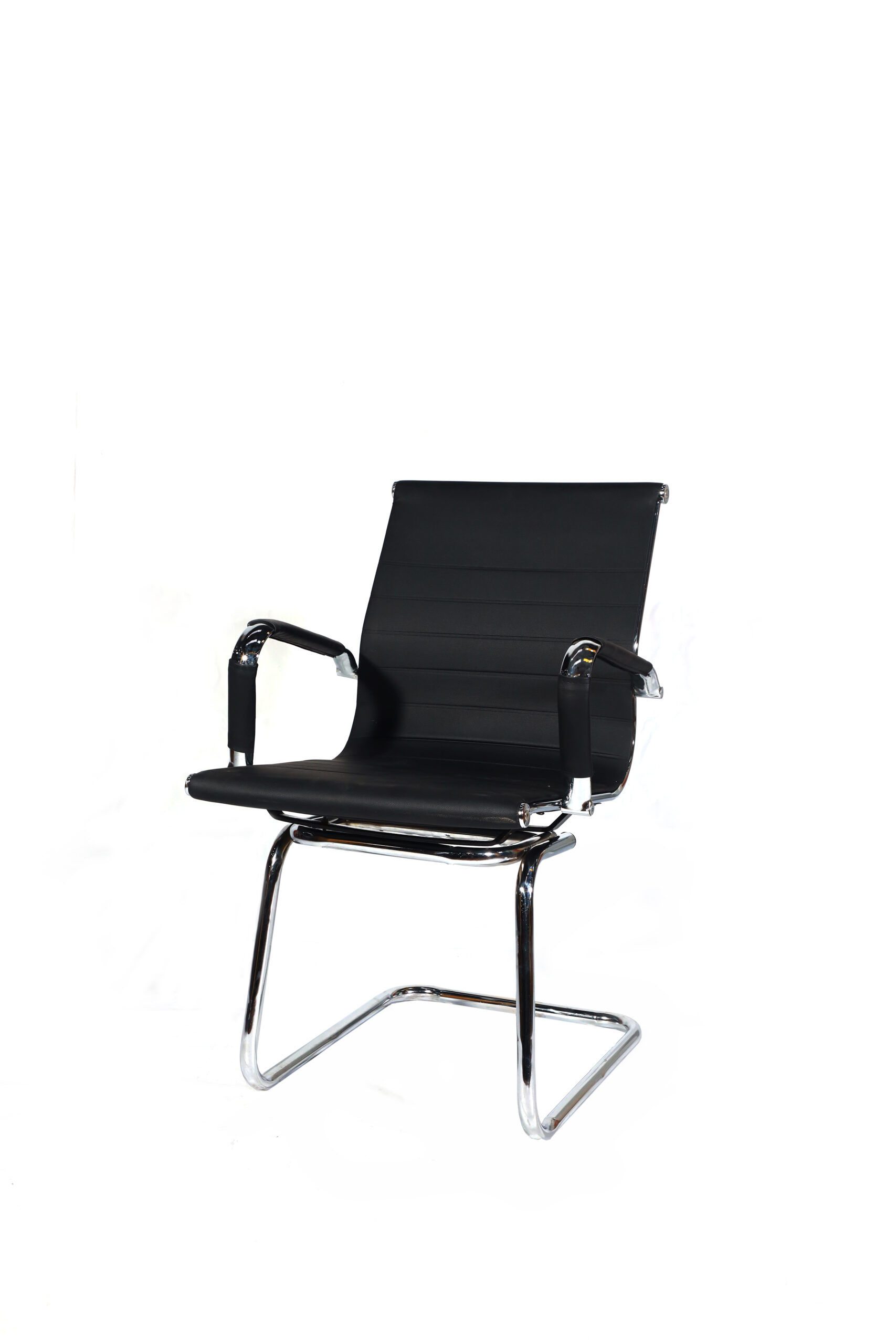 Inspired by classic mid-century modern design, this chair offers a clean, contemporary aesthetic perfect for conference rooms, executive offices, and reception areas. The chair features sleek, horizontal ribbing across the seat and back, upholstered in durable black PU leather that provides both comfort and a professional look.