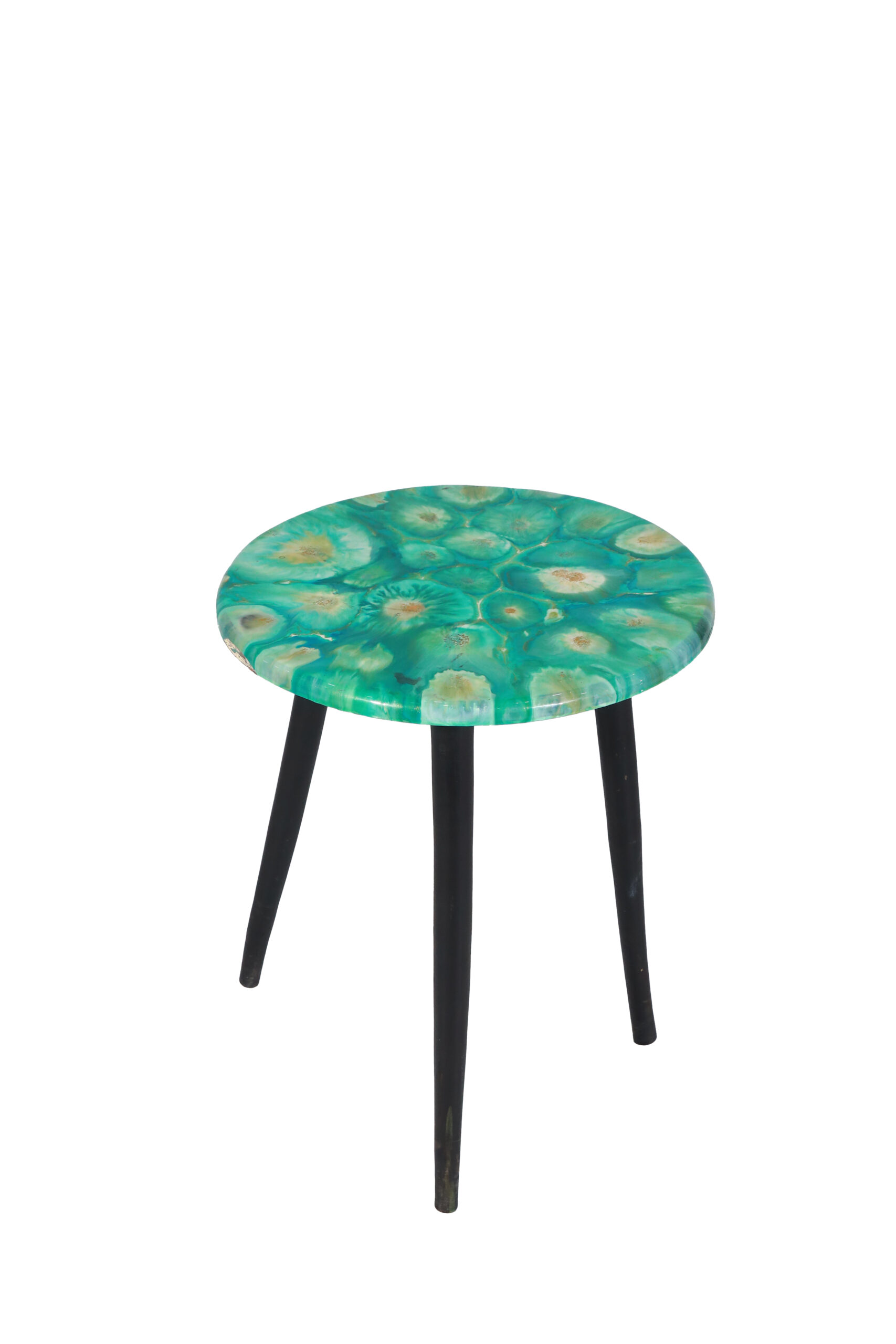 This is a beautiful, contemporary accent coffee table featuring a captivating geological-inspired design. The round tabletop is finished with a striking epoxy resin or high-gloss print that mimics the natural patterns of blue and white agate or geode slices, creating swirling concentric circles in shades of turquoise, cobalt, cream, and pale gold. This vibrant, high-gloss top is supported by a classic Mid-Century Modern base consisting of three sturdy, angled tapered wooden legs in a rich walnut or mahogany stain. This piece is ideal for adding a bold splash of color and an artistic, textural element to any living room, bedroom, or entryway, functioning perfectly as a unique plant stand or drink holder.