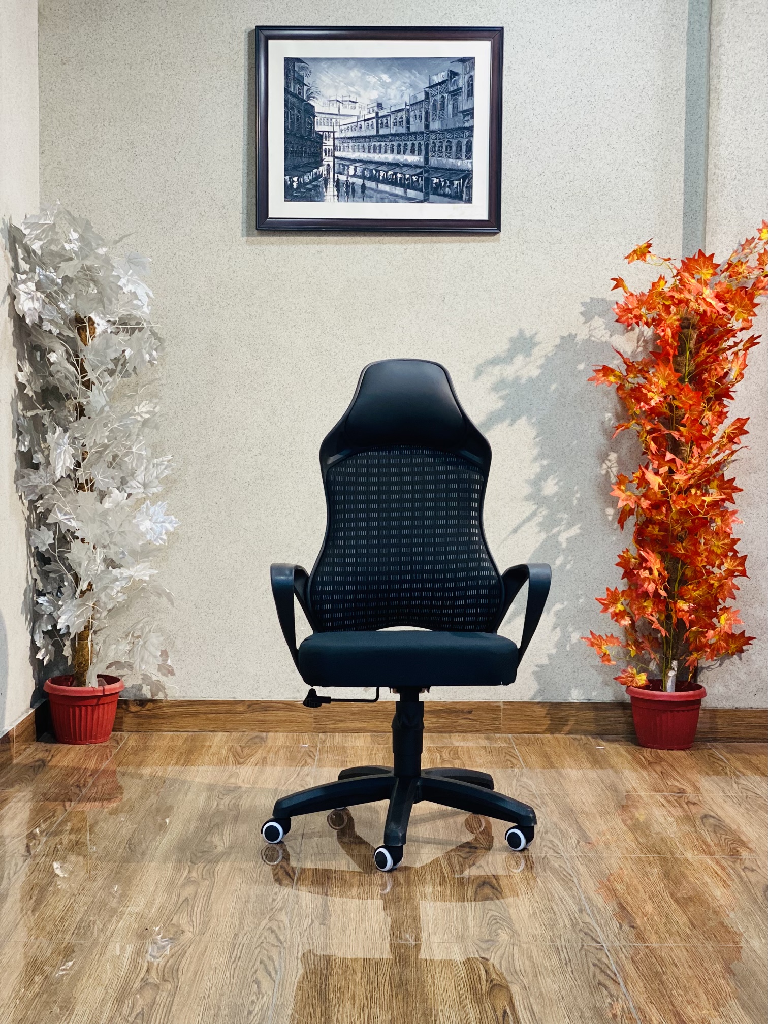 This high-back chair features a distinct sculpted backrest reminiscent of a racing seat, providing superior lateral support for your posture. The seat and headrest are upholstered in smooth black material, while the critical lumbar area utilizes a breathable mesh insert with a textured, dotted pattern. This ensures maximum airflow where you need it most, keeping you cool during extended use.
