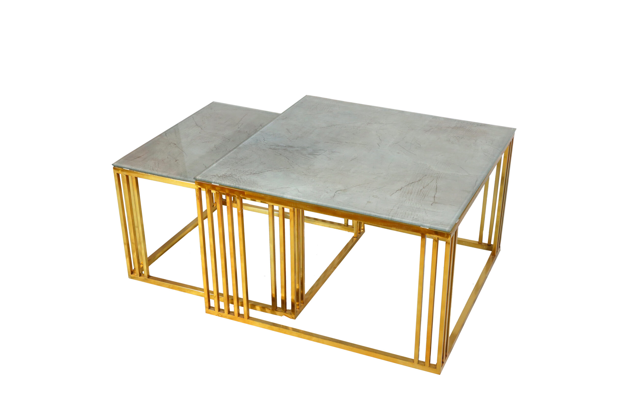 Tabletops: Each table is topped with a square surface that features a black finish with delicate, web-like gold or copper veining, designed to mimic the look of premium black marble (such as Nero Marquina).