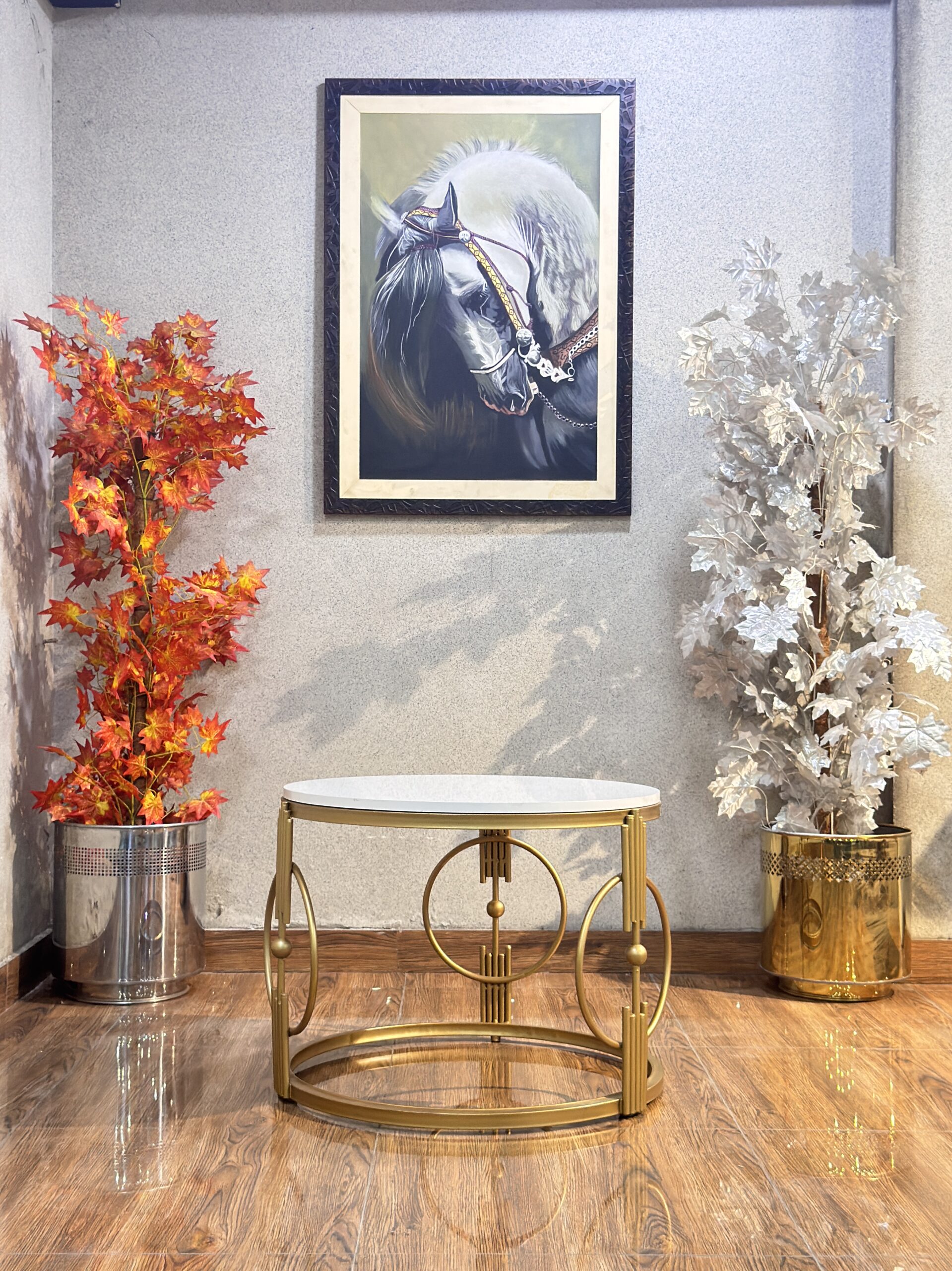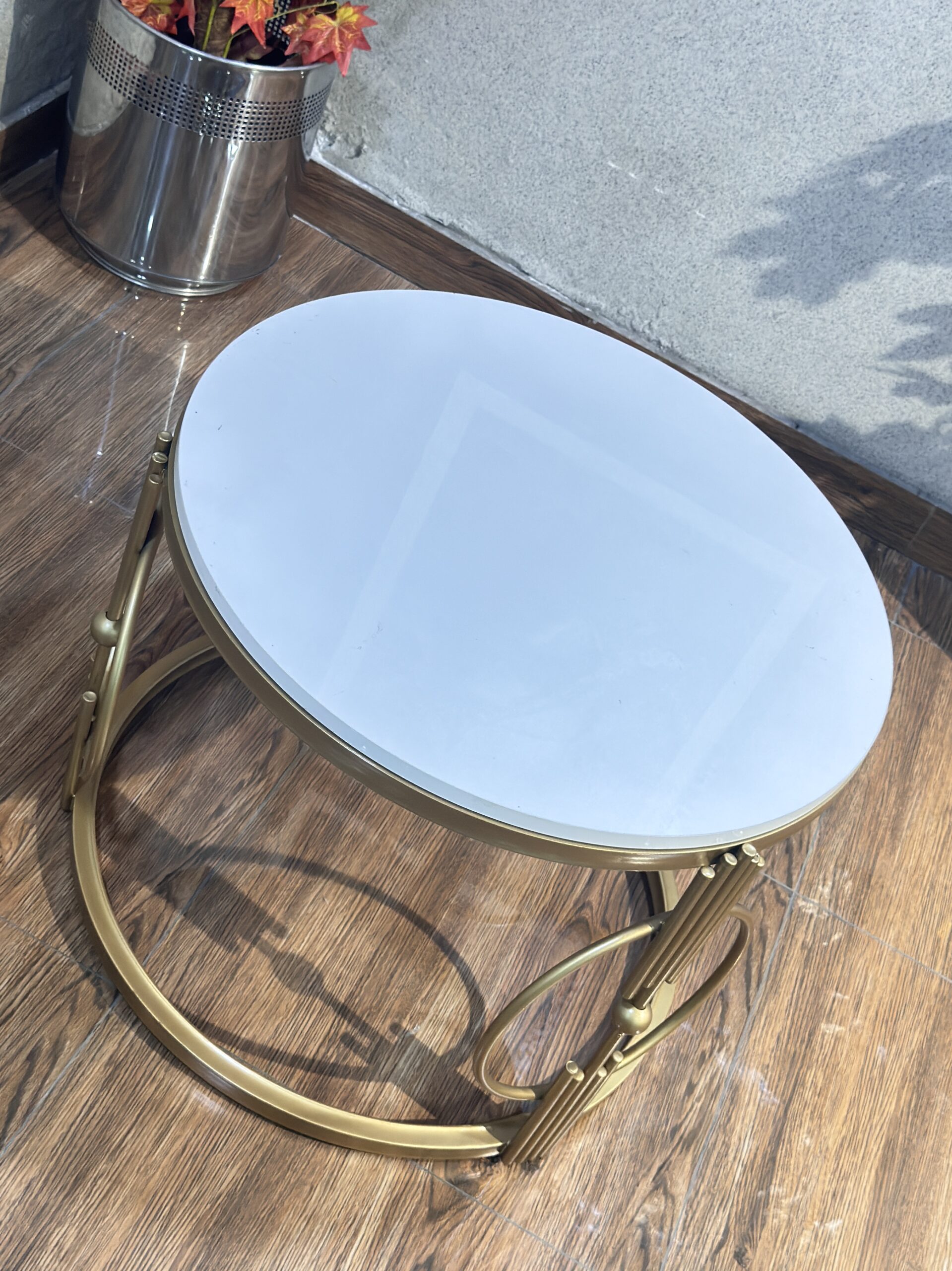 Infuse your home with a sense of light and luxury with this Ornate White & Gold Accent Table. Featuring a pristine white top and a uniquely decorative base, this piece is designed to serve as a sophisticated focal point. Its compact, circular silhouette makes it a perfect companion for a plush armchair or a stylish addition to a bedside setup.