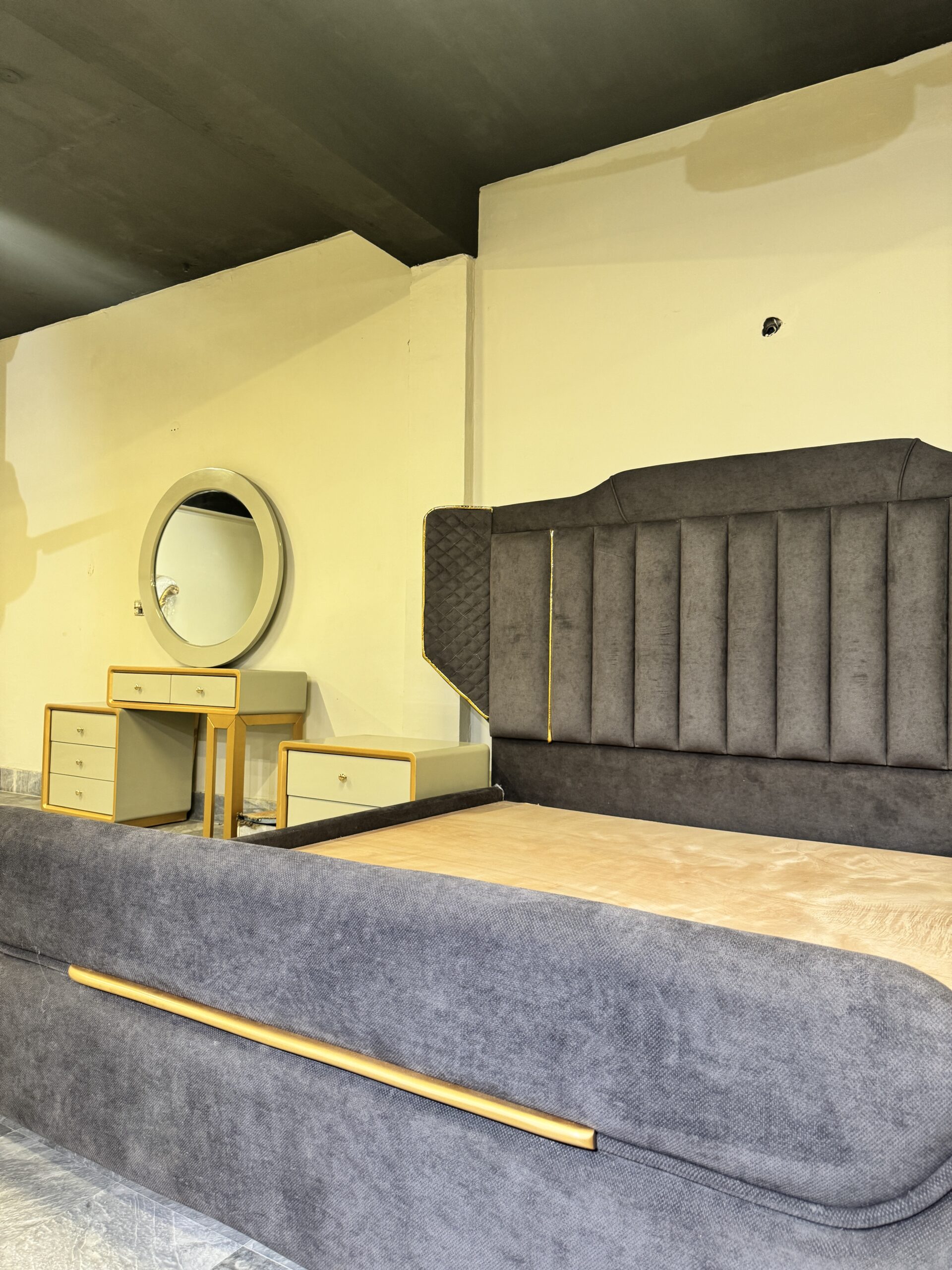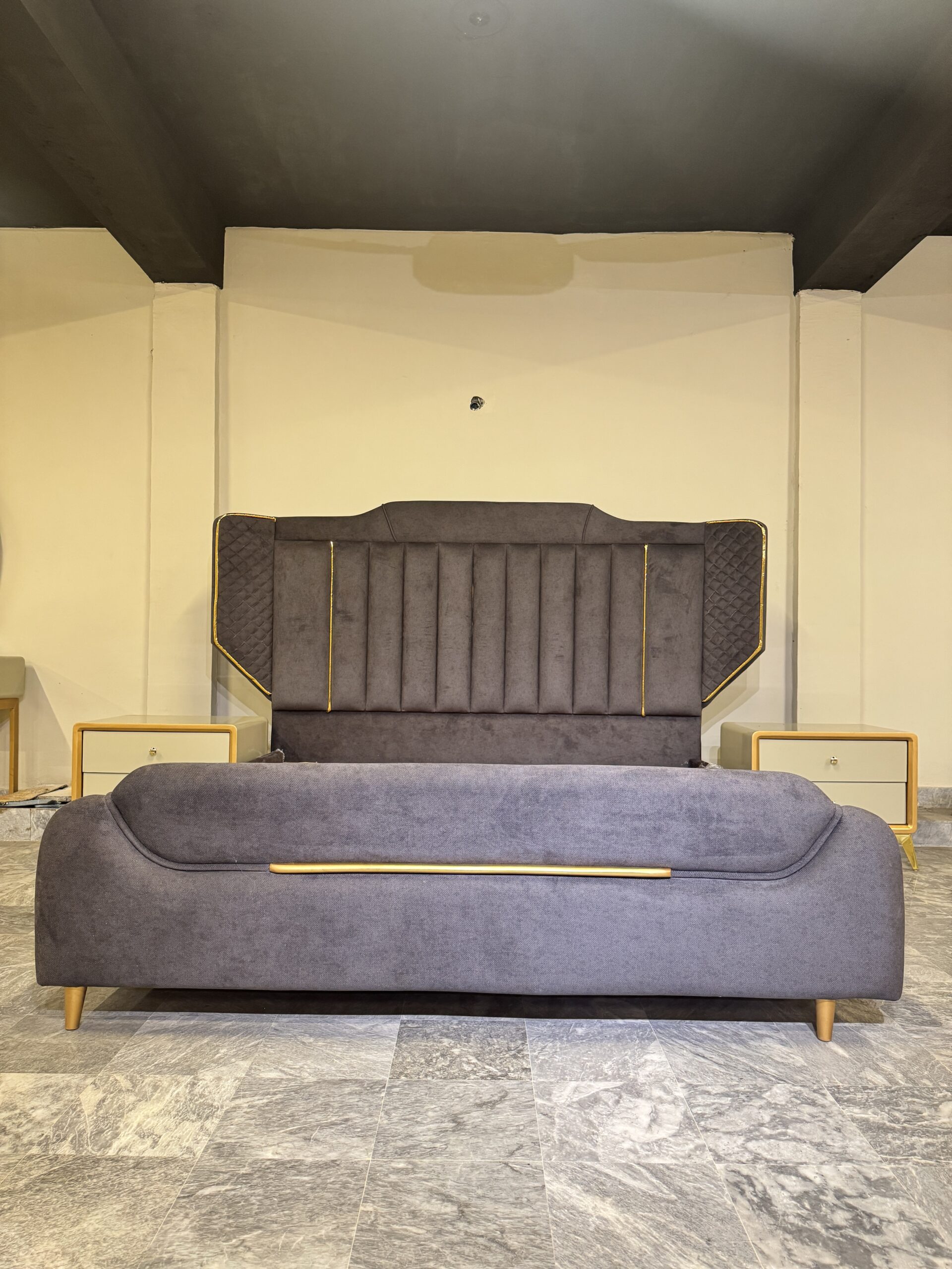 Command the room with the Onyx Wingback Sovereign Bed, a design that balances strength with soft, premium textures. Draped in a deep charcoal velvet, this set is designed for those who appreciate architectural lines and a regal presence.