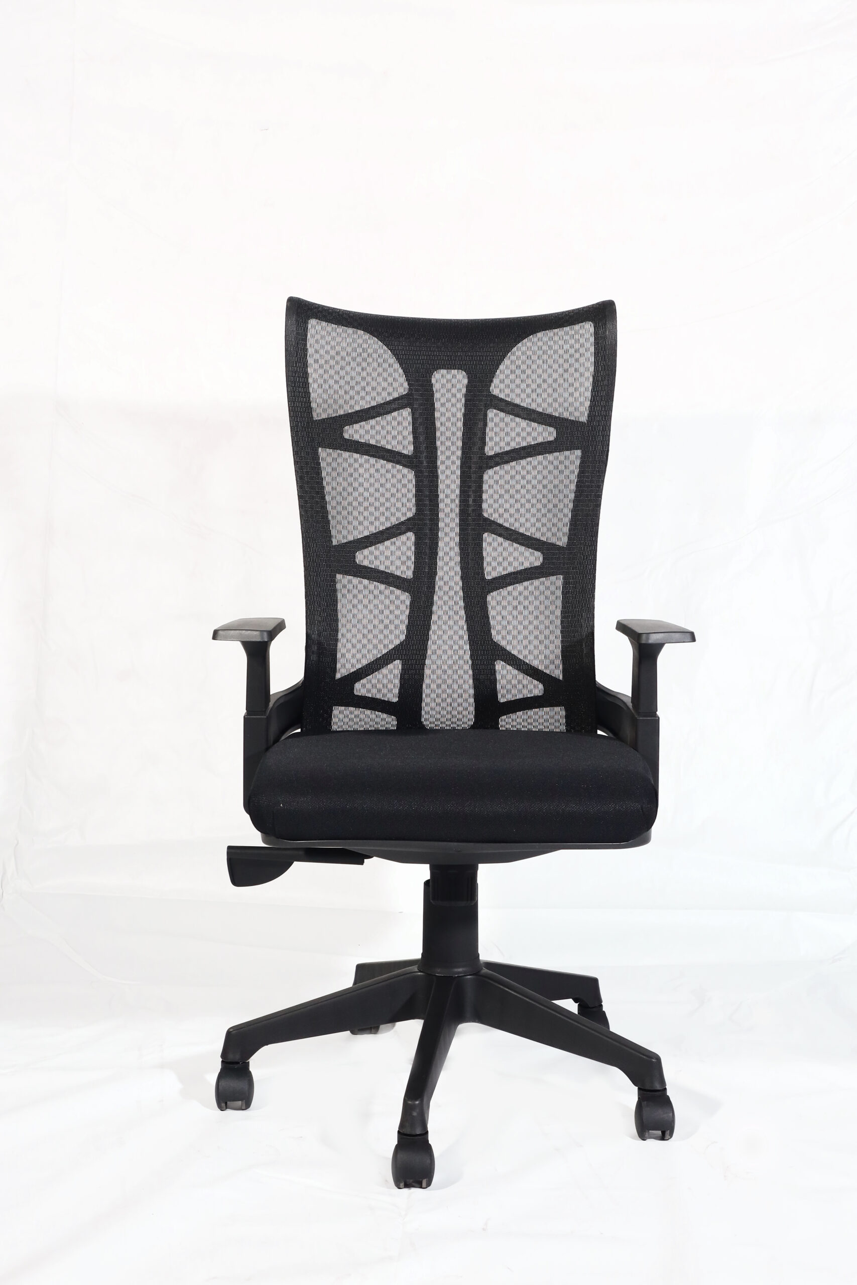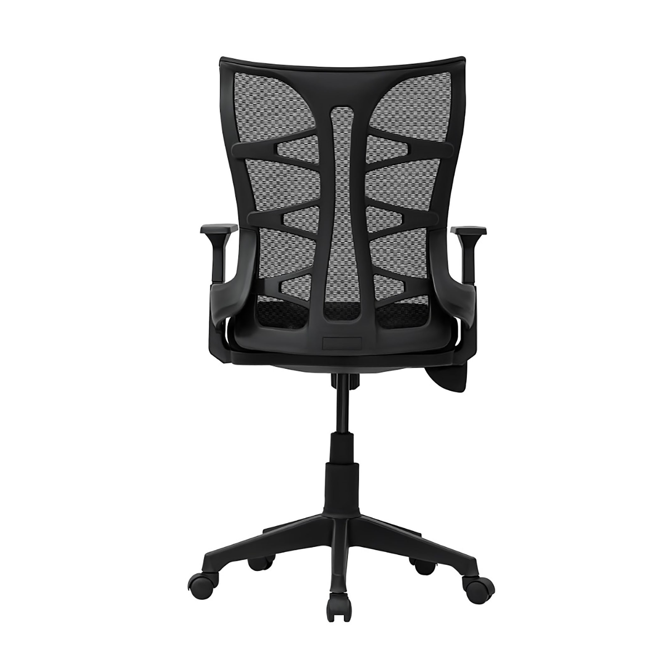 The chair features a highly breathable, adaptive black mesh backrest with a distinctive, supportive structure designed to promote consistent airflow and prevent heat buildup. This intelligent mesh design provides articulated lumbar support, gently cradling your lower back to maintain healthy posture and reduce fatigue throughout your workday.
