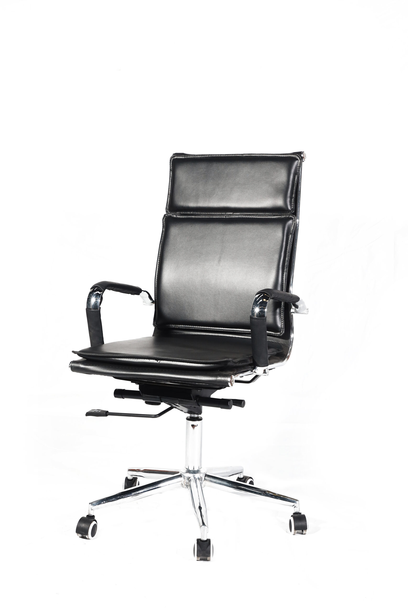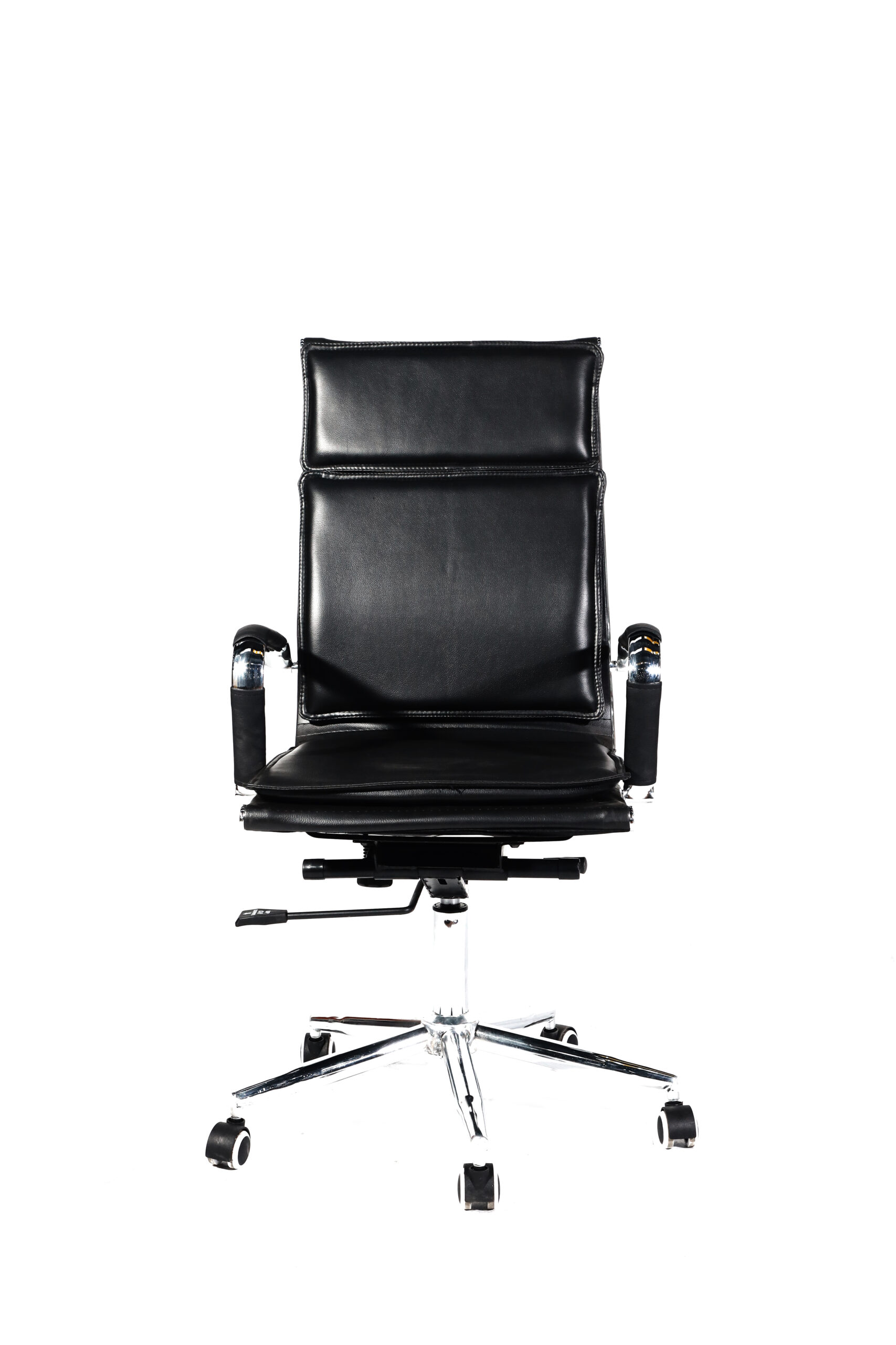 Built for a commanding presence, the chair features a brilliant chrome-finished metal base and elegant chrome armrests topped with padded black sleeves for added comfort. This durable construction ensures reliable support and stability, while the smooth-rolling casters provide effortless mobility across your workspace.