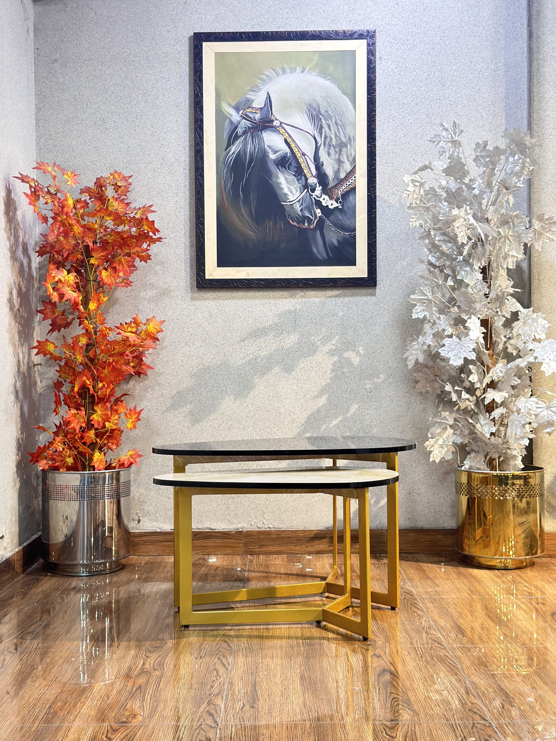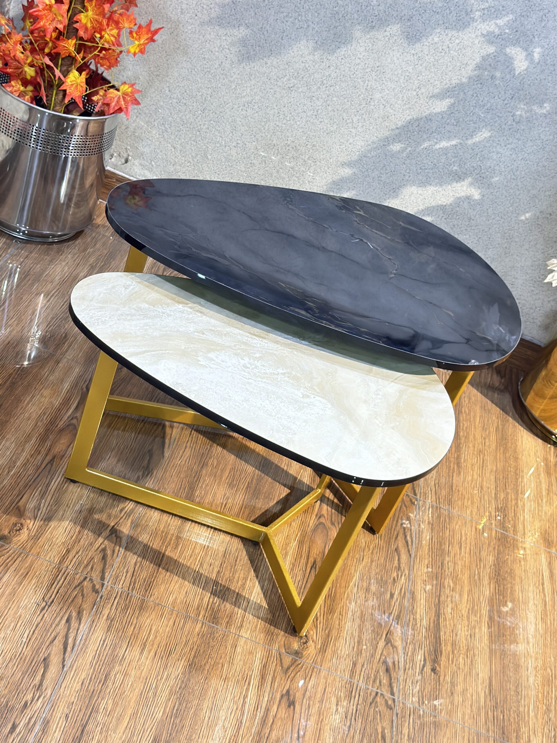 Elevate your living space with this sophisticated set of tiered nesting tables. Featuring a unique “guitar pick” or organic pebble silhouette, these tables break away from traditional sharp angles to bring a softer, more fluid energy to your interior. The set consists of two interlocking pieces of varying heights, allowing for a dynamic, layered look or separate use when extra surface area is needed.