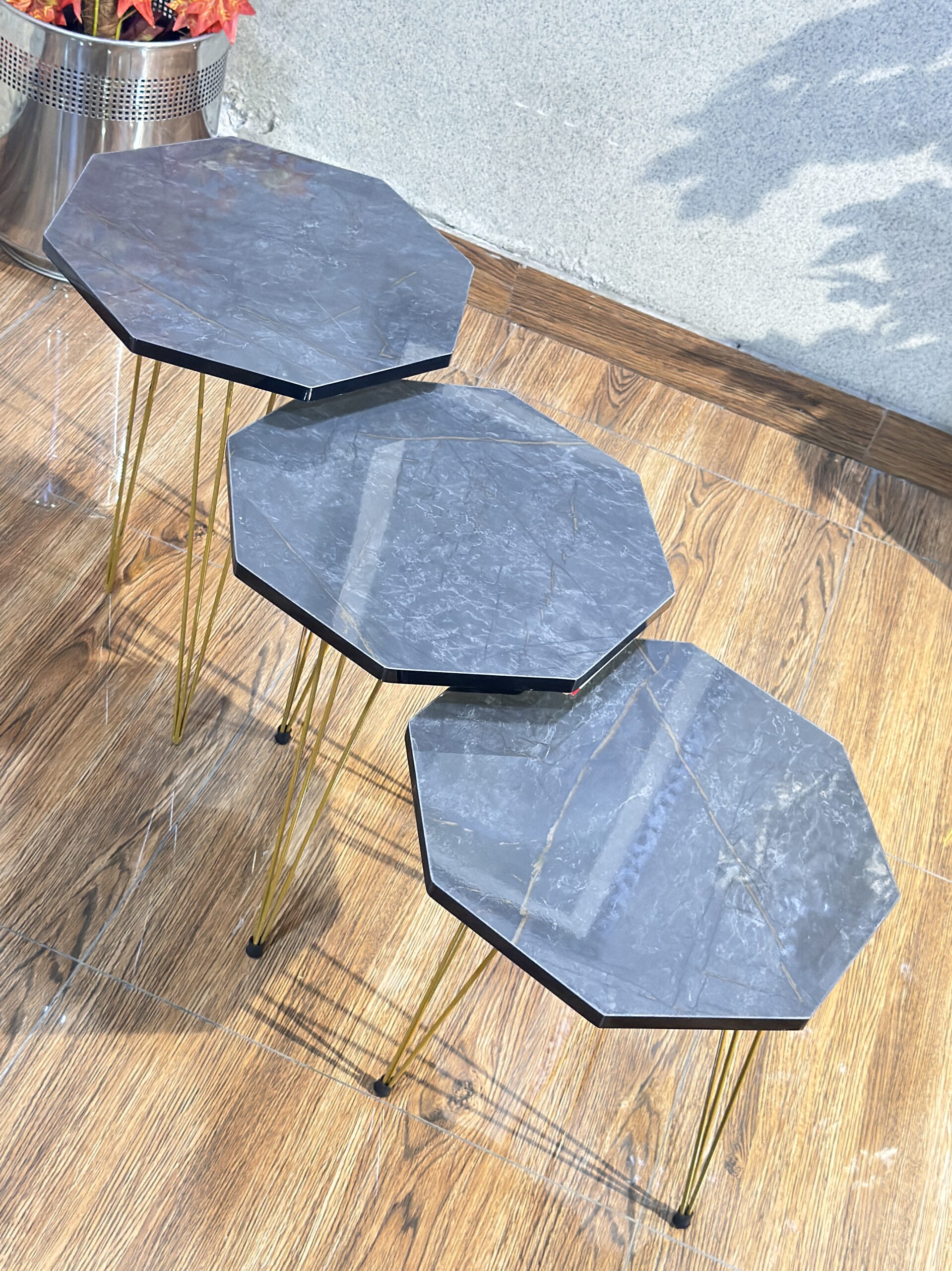 Break away from standard circles and squares with this Octagonal Nesting Table Set. This three-piece collection features a bold, multi-angled silhouette that adds an architectural element to any room. Whether clustered together to create a tiered centerpiece or spread throughout a space to provide matching surfaces for guests, these tables are as functional as they are decorative.