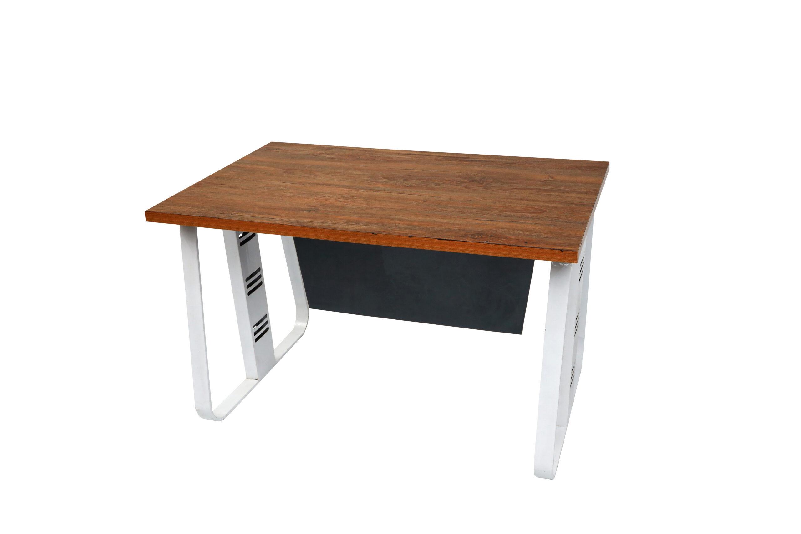 Legs/Base: The desk rests on a combination of supports: one end is a solid panel that meets the floor, and the other end is supported by the stylish, short, angled legs on the drawer cabinet.